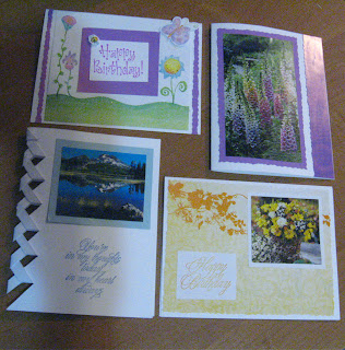 and we had fun making some invitations for a baby shower that we are holding this coming Saturday. I printed out the inside but we decided to have fun decorating the outside- each one an original. We used various pictures (from an Ann Geddes Calendar and other places), paper scraps and stamps. Below is the finished project. They were simple but we thought rather fun.This week I decided to set aside quite a bit of time to make a bunch of cards in an effort to be ready for this new year. I am actually hoping to get them all addressed soon too (for the whole year!) so that I will just need to add a note when the Birthday/ Anniversary comes and then off they can go very easily.